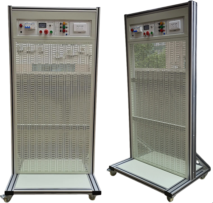 網(wǎng)孔板維修電工實訓(xùn)平臺采用立式結(jié)構(gòu) 開放式設(shè)計,主體采用40*80鋁型材做骨架,周邊采用冷扎鋼板做封板板,表面靜電噴塑處理,整機既堅固耐用,又美觀大方。底部裝有帶腳墊萬向輪,萬向移動時用,可調(diào)腳固定時用,移動固定兩相宜。頂部安裝電源模塊,下部為實訓(xùn)區(qū)域,依據(jù)任務(wù)安裝不同掛件。